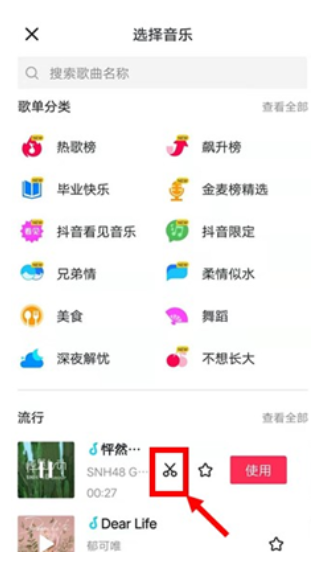 点击视频拍摄界面上方的“选择音乐”图标,进入选择音乐界面。